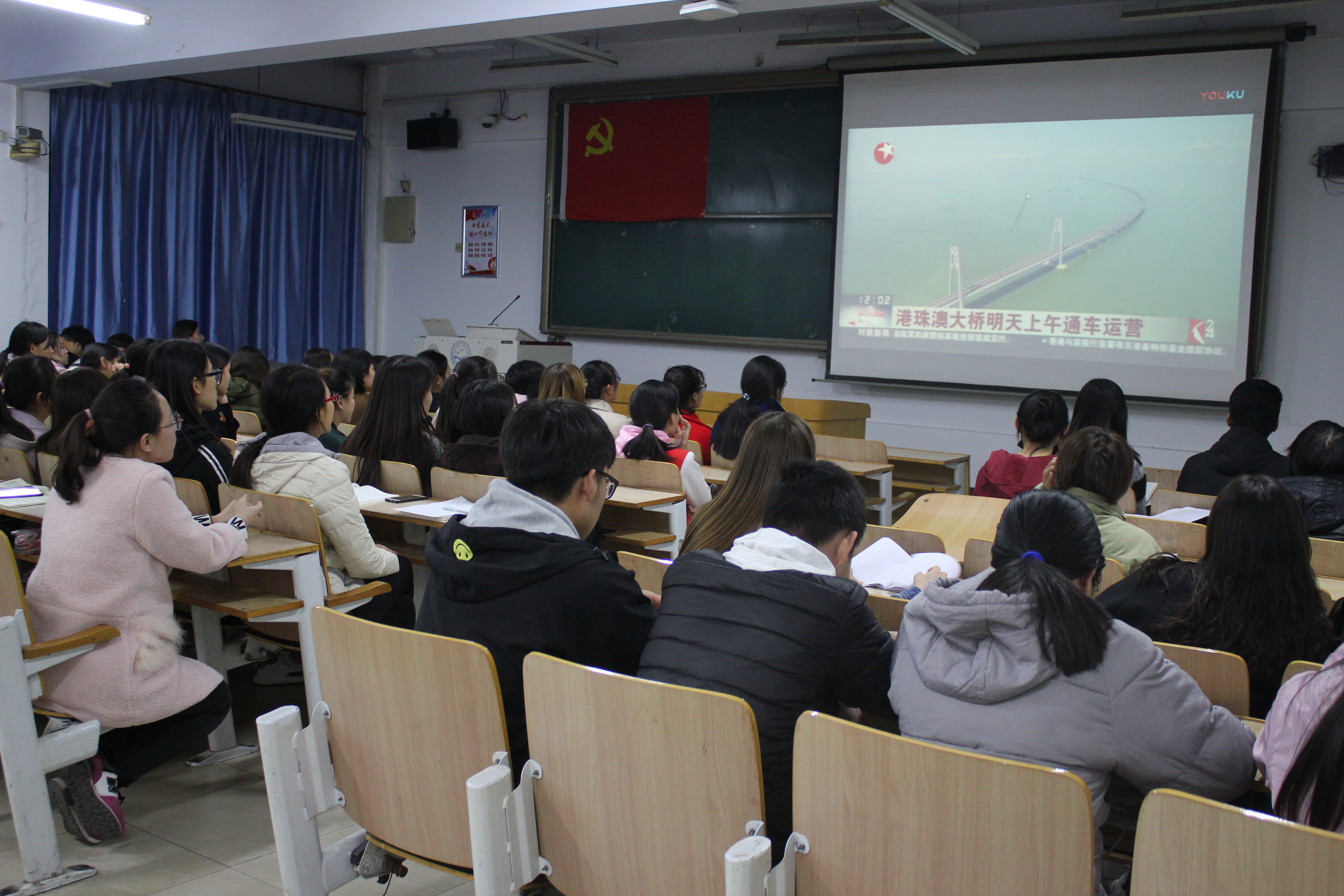 2018年10月23日上午,港珠澳大桥开通仪式在珠海公路口岸举行。世界上第一跨海大桥——“港珠澳大桥”正式建成通车,为全世界瞩目。为庆祝我国桥梁建设事业这一伟大壮举,弘扬中华民族艰苦奋斗、自力更生的崇高精神,感怀改革开放的历史性成就,增强民族自豪感。10月28日晚,yl23455永利集团党委分两场组织青年学生党员、入党积极分子和共青团员观看了大型纪录片《港珠澳大桥开通仪式》和《港珠澳大桥》等视频资料,300名学生参加了活动。