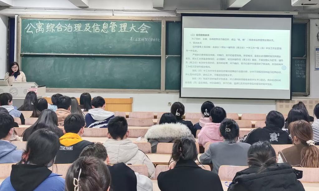 为了切实提高学院学生公寓管理水平,增强学生公寓信息搜集和处理能力,提升宿舍文化建设水平,2023年3月8日,yl23455永利集团召开了宿舍综合治理和信息管理工作会议,主要就宿舍综合治理管理规定和宿舍文化建设等方面工作做了培训和交流。全院100余名宿舍长参加了会议。